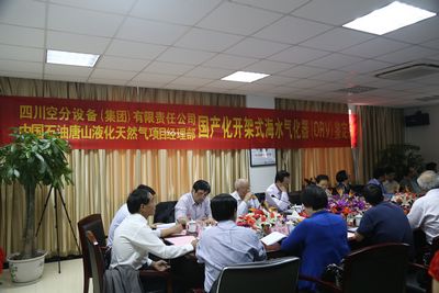 與會(huì)領(lǐng)導(dǎo)、專家及代表在(集團(tuán))公司領(lǐng)導(dǎo)陪同下首先參觀了一號(hào)廠房和氣化器生產(chǎn)現(xiàn)場(chǎng)及低溫試驗(yàn)現(xiàn)場(chǎng),隨后在大川公司三樓會(huì)議室召開了鑒定會(huì),會(huì)議隋永濱總工程師主持。四川空分(集團(tuán))公司董事長(zhǎng)、總經(jīng)理單金銘致歡迎詞,他對(duì)黃鸝副司長(zhǎng)、隋永濱總工程師、江楚標(biāo)總工程師和各位專家、代表參加鑒定會(huì)表示熱烈的歡迎和誠(chéng)摯的感謝!四川空分(集團(tuán))公司研究院詳細(xì)匯報(bào)了氣化器研制情況,鑒定委員會(huì)專家們?cè)敿?xì)審查了鑒定資料,對(duì)產(chǎn)品參數(shù)、性能、試驗(yàn)進(jìn)行了分析討論。鑒定專家對(duì)研制工作給予了高度評(píng)價(jià)和充分的肯定,并一致同意通過鑒定。