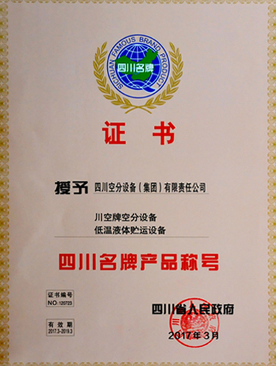 近日,我公司“川空”牌空分設(shè)備、低溫液體貯運(yùn)設(shè)備再次被四川省人民政府命名為四川名牌產(chǎn)品稱號。