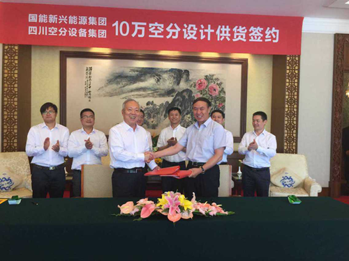 2015年7月22日12時28分,四川空分設(shè)備(集團(tuán))有限責(zé)任公司與國能新興能源集團(tuán)10萬空分設(shè)計供貨合同簽約儀式在北京釣魚臺國賓館成功舉行。出席簽約儀式的有國能新興能源集團(tuán)公司董事長王光明先生、四川空分設(shè)備(集團(tuán))有限責(zé)任公司董事長單金銘先生、副總經(jīng)理李成旭先生、謝波先生等,以及國能新興能源集團(tuán)公司副總經(jīng)理宋笠華先生、韓丹丹女士。