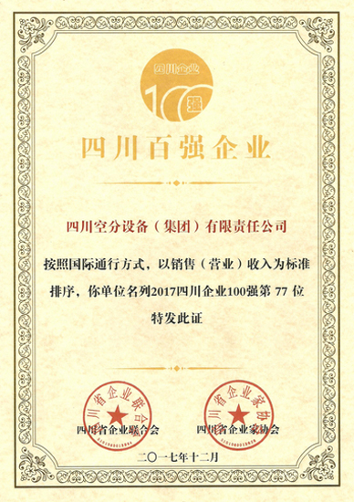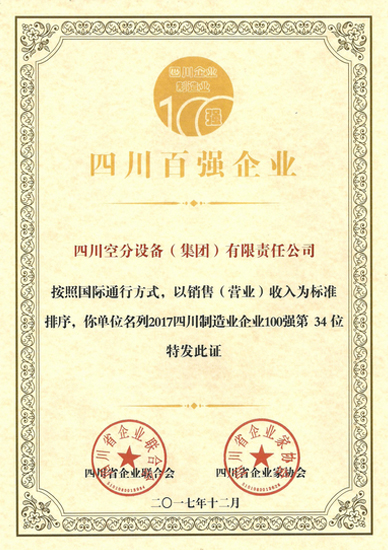 近日,我公司再次被四川省企業(yè)聯(lián)合會(huì)、四川省企業(yè)家協(xié)會(huì)評(píng)為四川百?gòu)?qiáng)企業(yè)。按照國(guó)際通行方式,以銷售(營(yíng)業(yè))收入為標(biāo)準(zhǔn)排序,我公司名列2017四川制造業(yè)企業(yè)100強(qiáng)第34位、2017四川企業(yè)100強(qiáng)第77位。