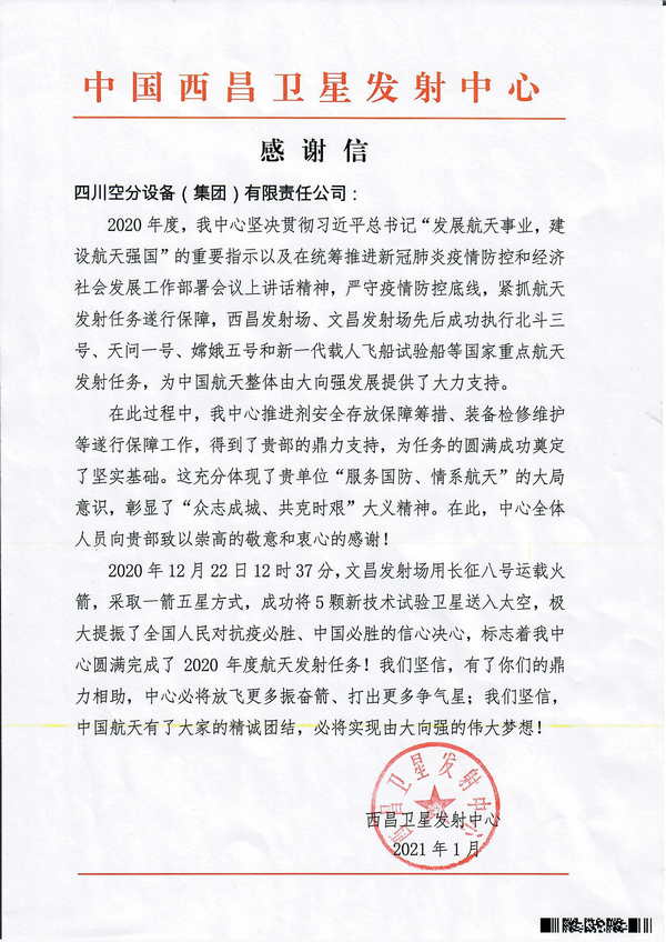 近日,西昌衛(wèi)星發(fā)射中心給我公司發(fā)來(lái)感謝信,對(duì)我公司在西昌發(fā)射場(chǎng)、文昌發(fā)射場(chǎng)先后成功執(zhí)行北斗三號(hào)、天問(wèn)一號(hào)、嫦娥五號(hào)和新一代載人飛船試驗(yàn)船等國(guó)家重點(diǎn)航天發(fā)射任務(wù)過(guò)程中,為西昌衛(wèi)星發(fā)射中心推進(jìn)劑安全存放保障籌措、裝備檢修維護(hù)等遂行保障工作提供的大力支持致以崇高的敬意和衷心的感謝。