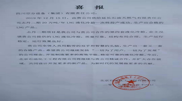 喜訊:由四川空分設(shè)計(jì)制造的志丹二期20萬(wàn)噸/年LNG液化冷箱一次性投產(chǎn)成功