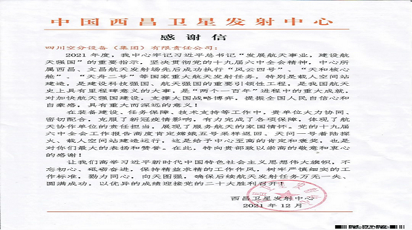 我公司再次收到西昌衛(wèi)星發(fā)射中心的感謝信