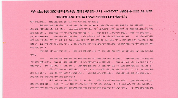單金銘董事長給淄博魯川400T液體空分膨脹機(jī)項目研發(fā)小組的賀信